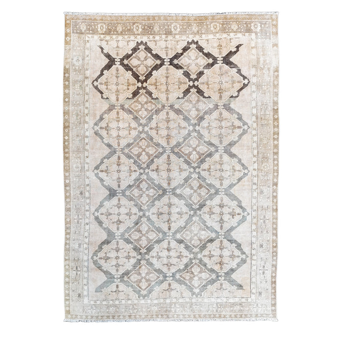 This vintage Turkish handwoven rug has a beautiful neutral background with gray and brown accents.