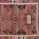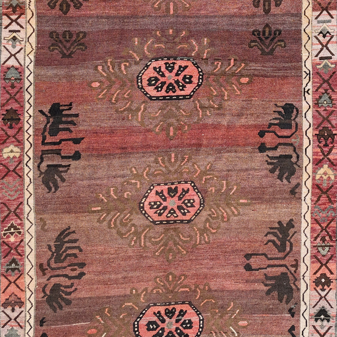 This vintage Turkish handwoven rug has a beautiful brown background with salmon, mauve, black, and brown accents.