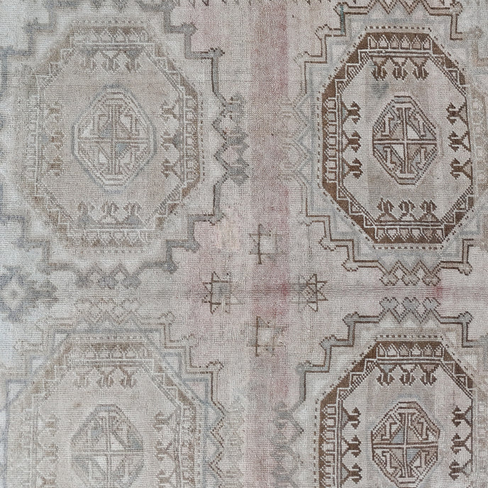 This vintage Turkish handwoven rug has a beautiful neutral background with brown and gray accents.