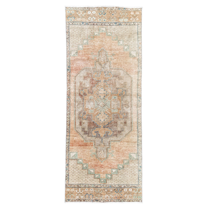 This vintage Turkish handwoven rug has a beautiful peach background with aqua, olive, blue, tan, brown, and neutral accents.
