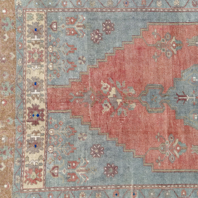 This vintage Turkish handwoven rug has a beautiful salmon background with blue, gray, green, tan, and neutral accents.