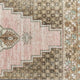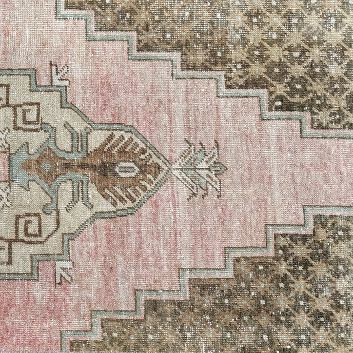 This vintage Turkish handwoven rug has a beautiful pink background with brown, aqua blue and neutral accents.