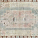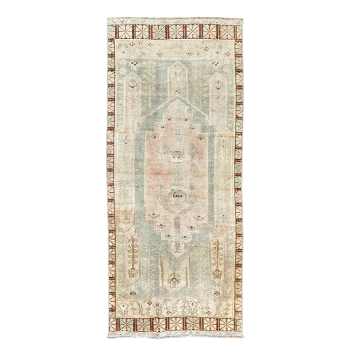 This vintage Turkish handwoven rug has a beautiful neutral background with brown, green, blue, pink, and neutral accents.