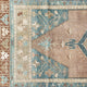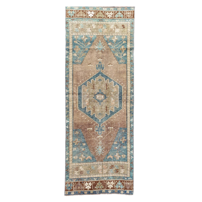 This vintage Turkish handwoven rug has a beautiful brown background with blue, tan, olive, and neutral accents.