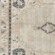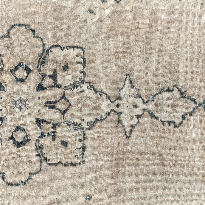 This vintage Turkish handwoven rug has a beautiful neutral background with blue, tan, brown, and neutral accents.