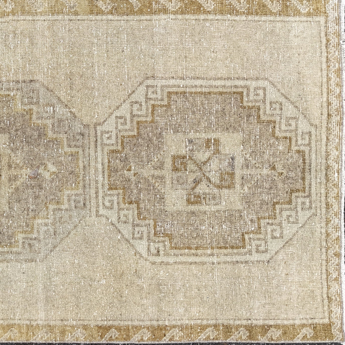 This vintage Turkish handwoven rug has a beautiful neutral background with brown, gold, tan and neutral accents.