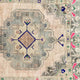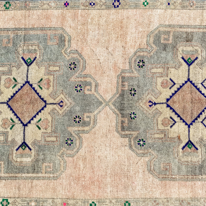 This vintage Turkish handwoven rug has a beautiful neutral background with brown, tan, green, blue, pink and neutral accents.