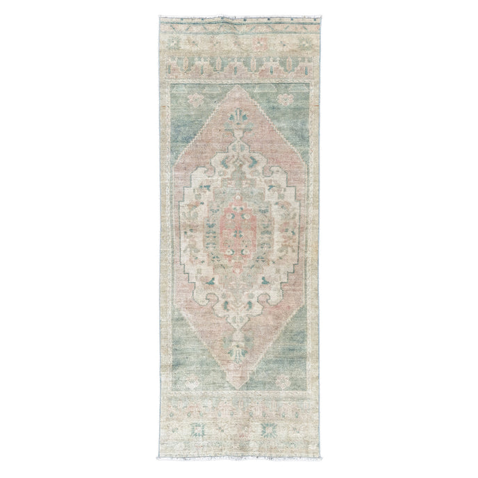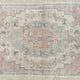 This vintage Turkish handwoven rug has a beautiful neutral pink background with blue, green and neutral accents.