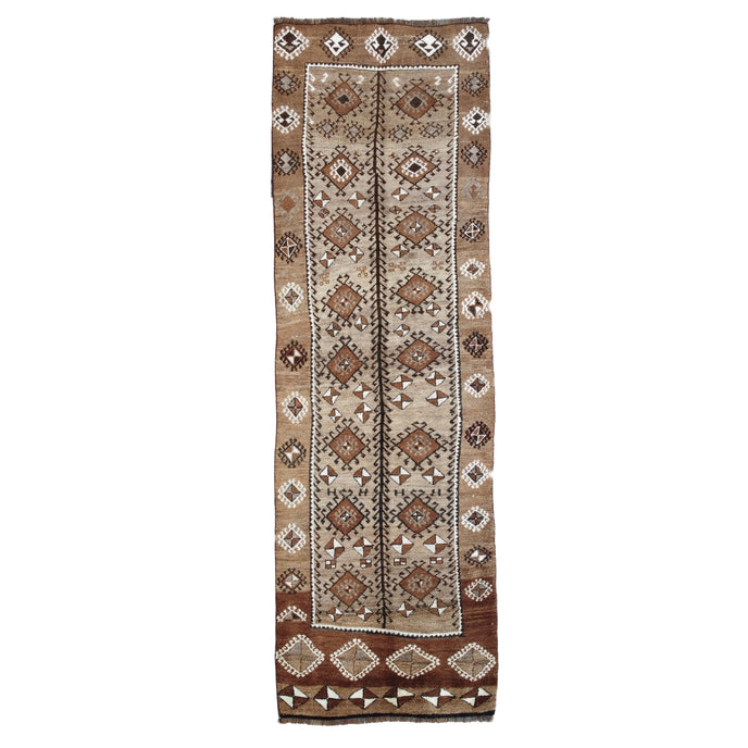 This vintage Turkish handwoven rug has a beautiful brown background with neutral accents.