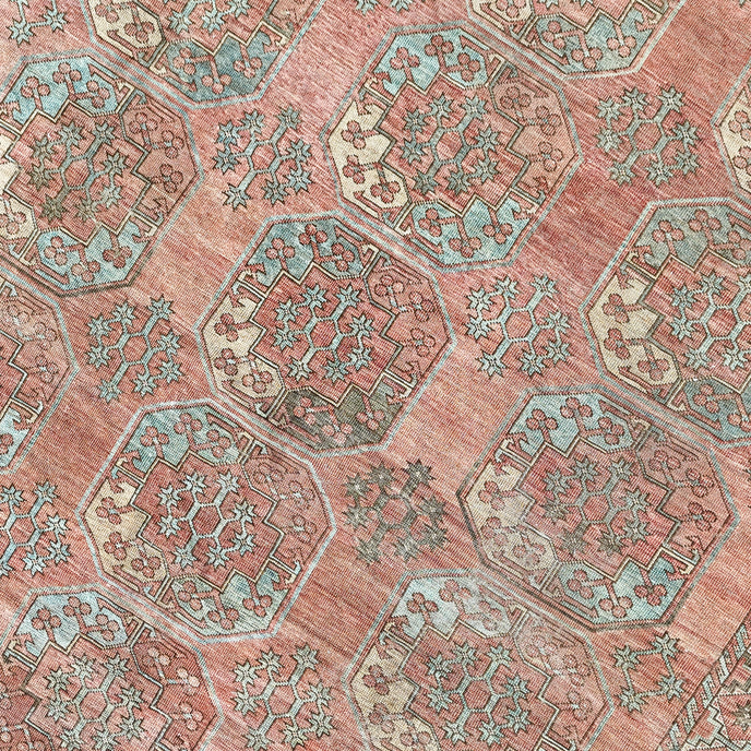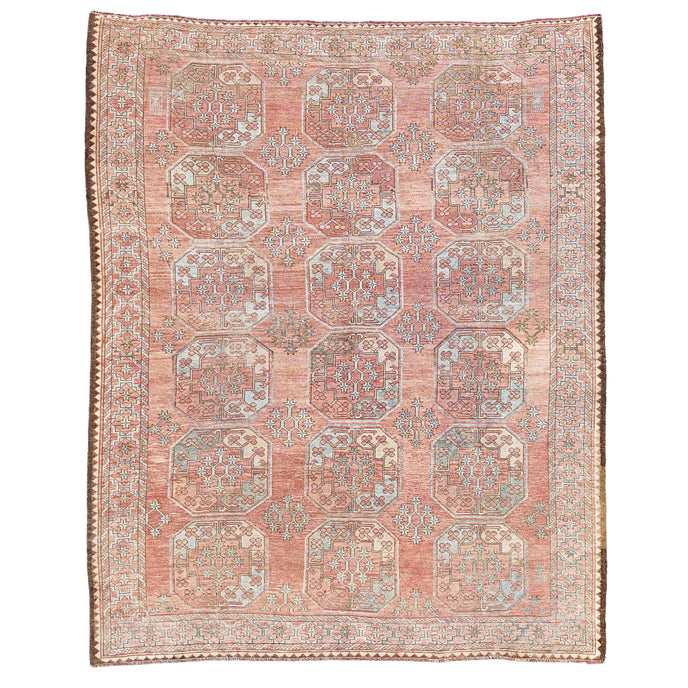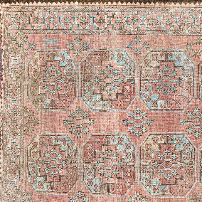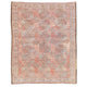 This vintage Turkish handwoven rug has a beautiful salmon background with pink, blue, olive, and brown accents.