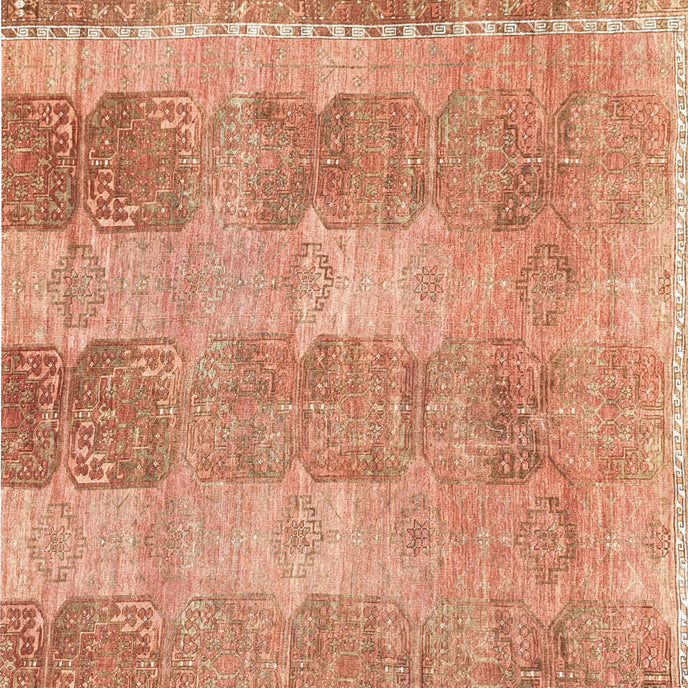 This vintage Turkish handwoven rug has a beautiful salmon background with pink, olive, and brown accents.