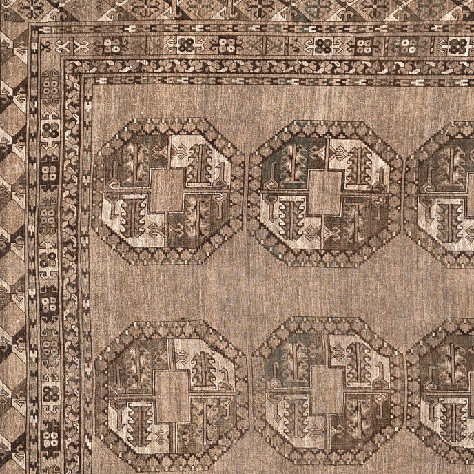 This vintage Turkish handwoven rug has a beautiful brown background with olive and tan accents.
