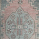 This vintage Turkish handwoven rug has a beautiful blue background with pink, blue, and neutral accents.