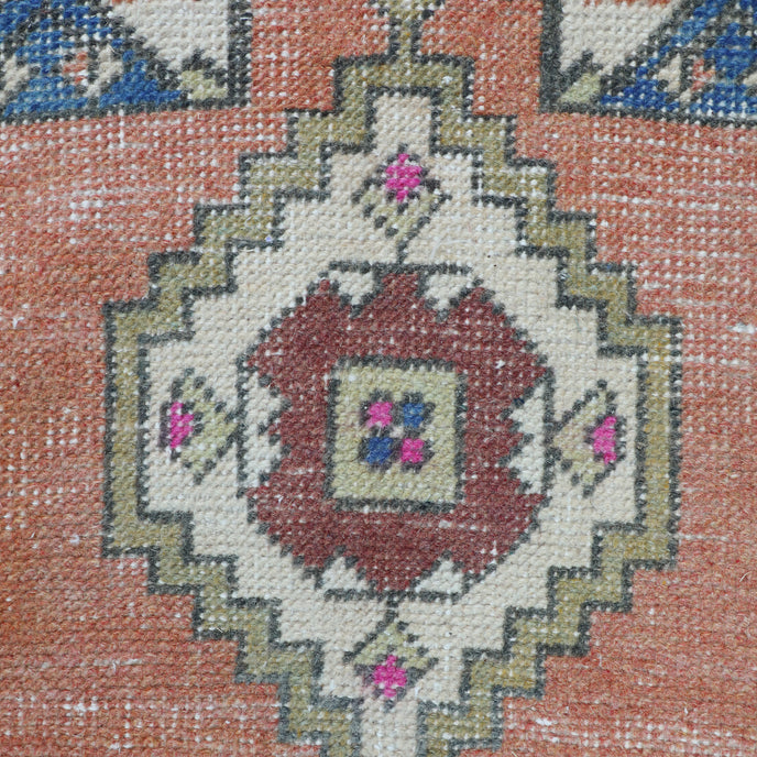 This vintage Turkish handwoven rug has a beautiful orange background with blue, green, pink, and neutral accents.
