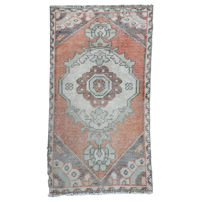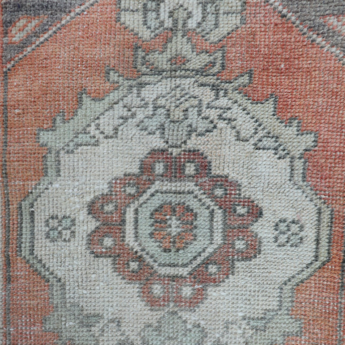 This vintage Turkish handwoven rug has a beautiful orange background with grey and tan accents.
