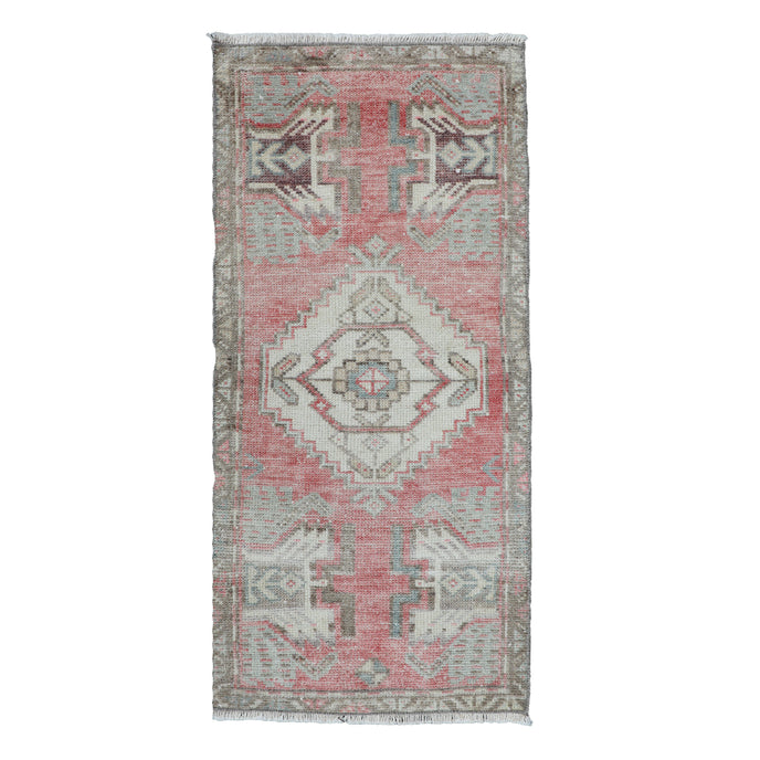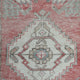 This vintage Turkish handwoven rug has a beautiful pinkish red background with white and grey accents.