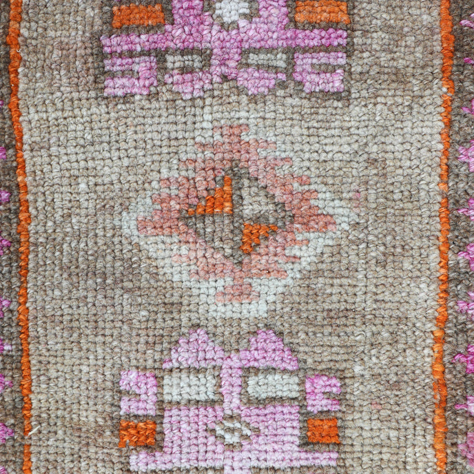 This vintage Turkish handwoven rug has a beautiful tan background with gray, pink, orange, and neutral accents.