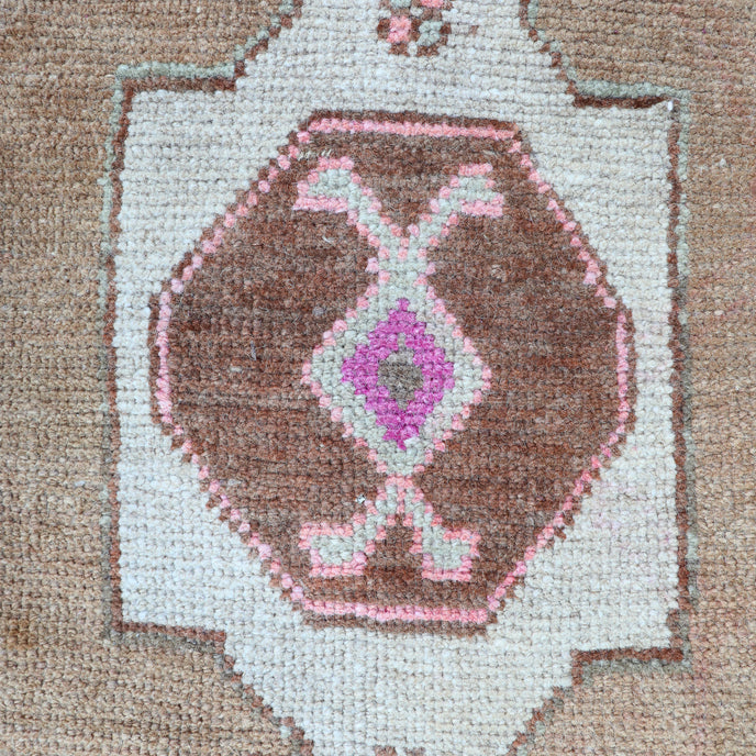 This vintage Turkish handwoven rug has a beautiful neutral background with pink, tan, and neutral accents.