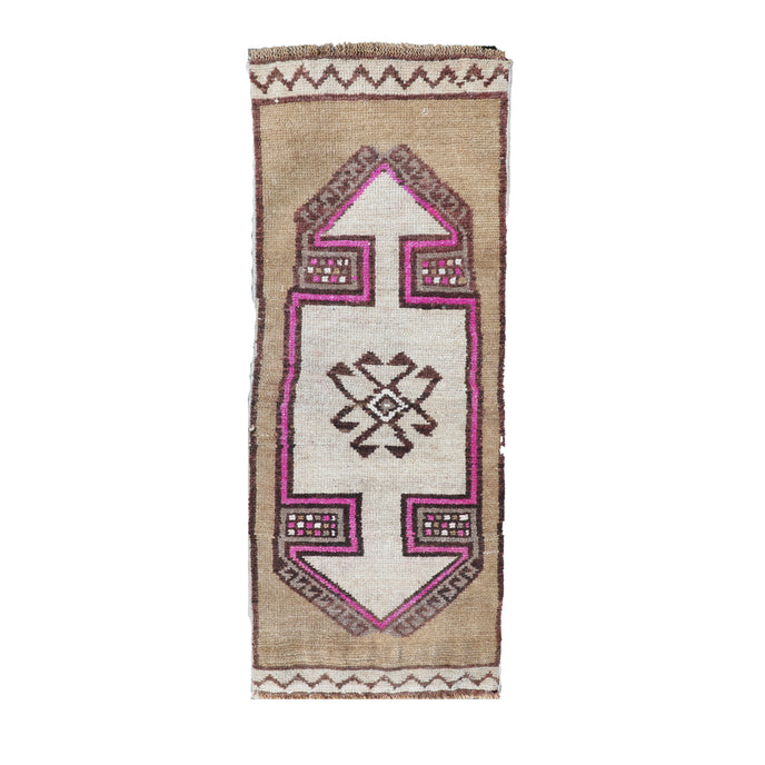 This vintage Turkish handwoven rug has a beautiful neutral background with brown, pink, and neutral accents.