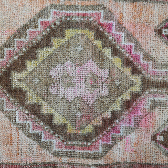 This vintage Turkish handwoven rug has a beautiful peach background with pink, yellow, olive, brown and neutral accents.
