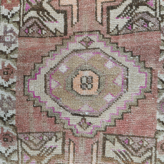This vintage Turkish handwoven rug has a beautiful pink background with brown, peach, and neutral accents.
