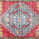 This vintage Turkish handwoven rug has a beautiful red background with blue, gray, pink, gold, and neutral accents.