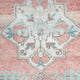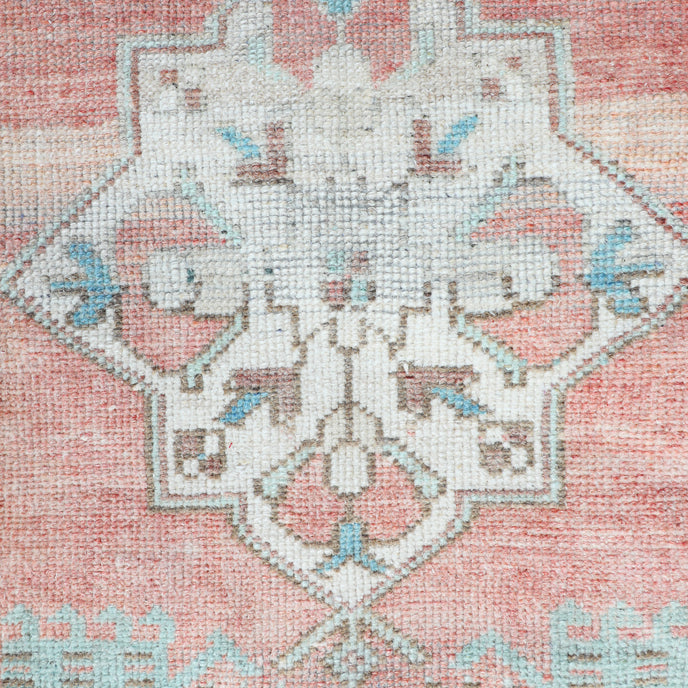 This vintage Turkish handwoven rug has a beautiful pink background with blue, green, tan, and neutral accents.
