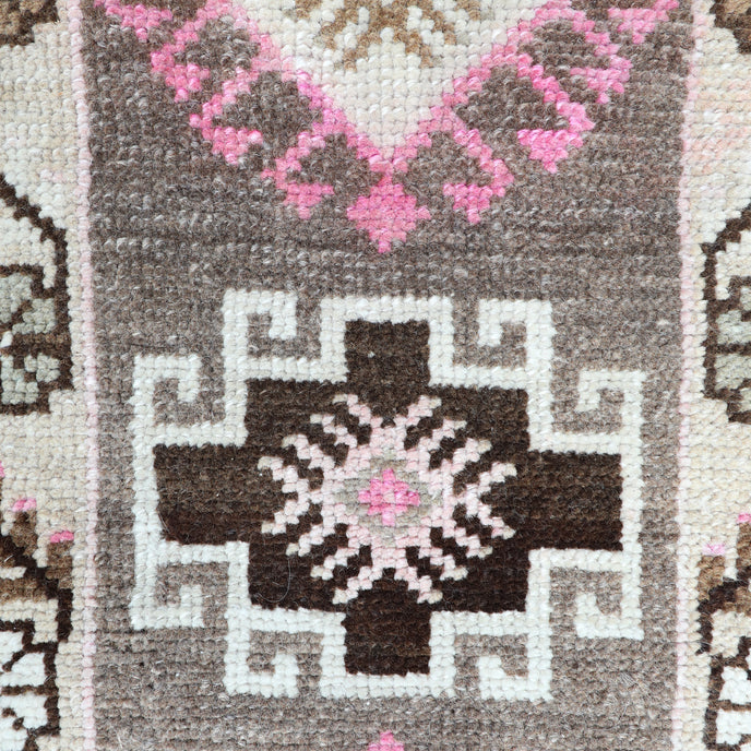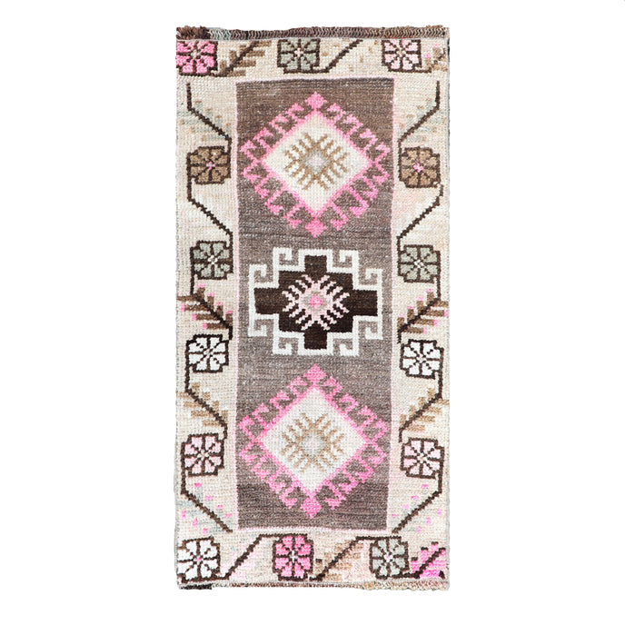 This vintage Turkish handwoven rug has a beautiful brown background with pink, tan, and neutral accents.