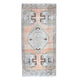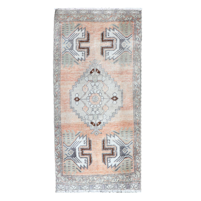 This vintage Turkish handwoven rug has a beautiful peach background with green, gray, and neutral accents.