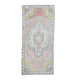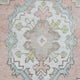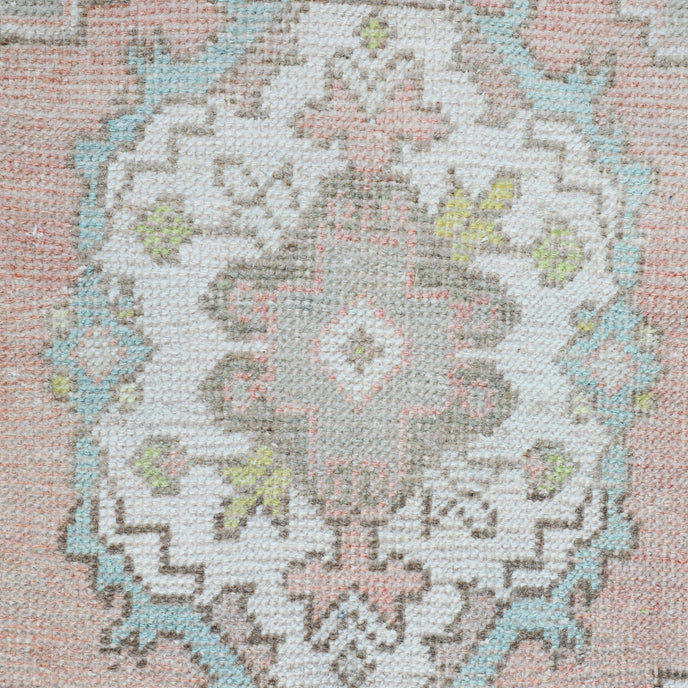 This vintage Turkish handwoven rug has a beautiful pink background with green, blue, tan, and neutral accents.