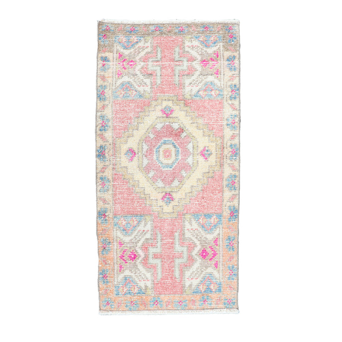 This vintage Turkish handwoven rug has a beautiful pink background with blue, green, yellow, and neutral accents.