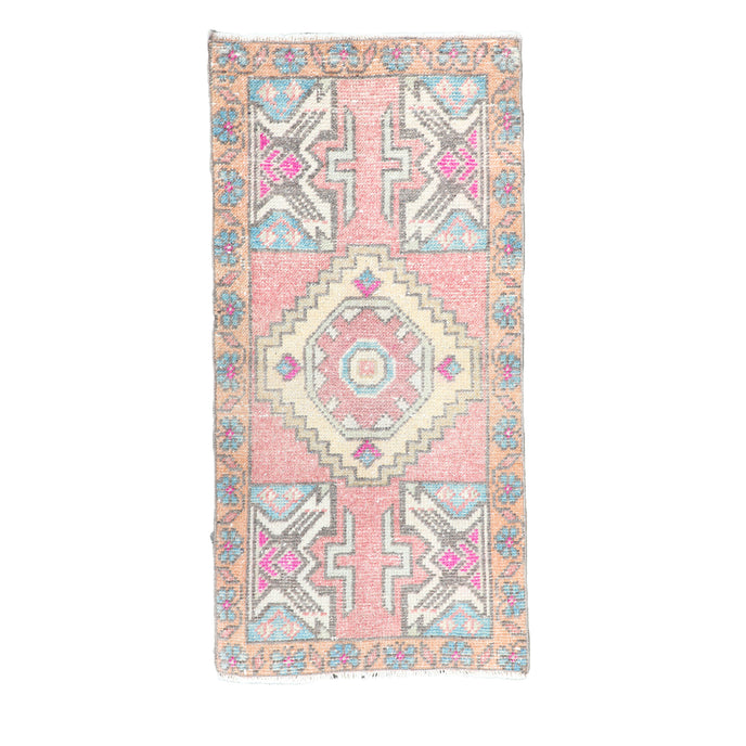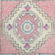 This vintage Turkish handwoven rug has a beautiful pink background with blue, green, orange, and neutral accents.