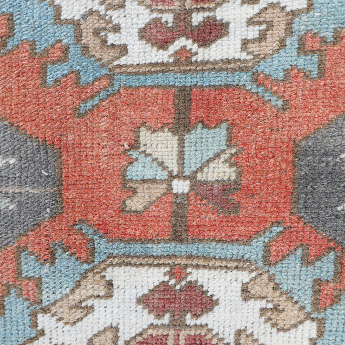 This vintage Turkish handwoven rug has a beautiful orange background with blue, tan, gray, and neutral accents.