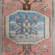 This vintage Turkish handwoven rug has a beautiful rust and peach background with blue, brown, and neutral accents.