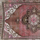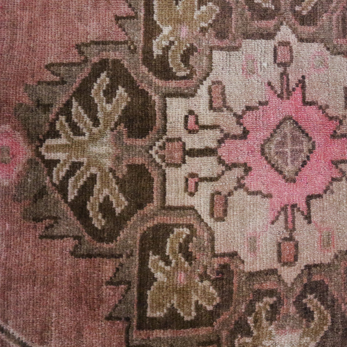 This vintage Turkish handwoven rug has a beautiful pink background with black, brown, and tan accents.